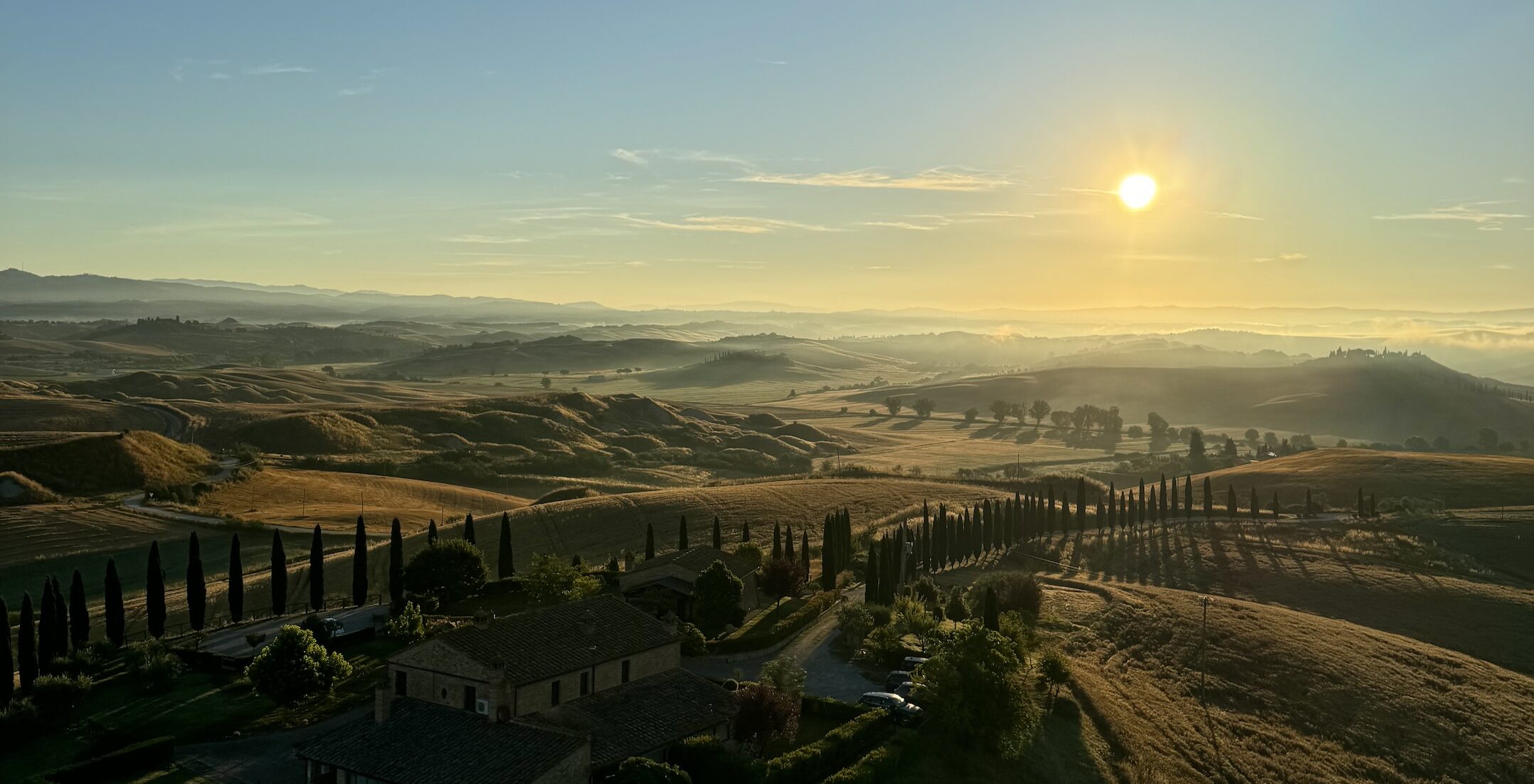 This morning is nothing less than extraordinary. Before dawn, we’ll depart Città della Pieve in the quiet stillness of early morning, setting out on what feels much like a pilgrimage of its own. As the landscape gradually awakens, we’ll travel toward the Tuscan countryside near Siena for a sunrise hot air balloon flight that offers a rare opportunity to witness the land from above.